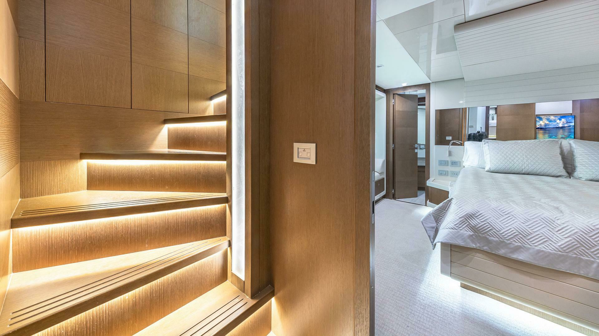 Owner’s Stateroom: Full beam king bed, safe, ensuite, tv